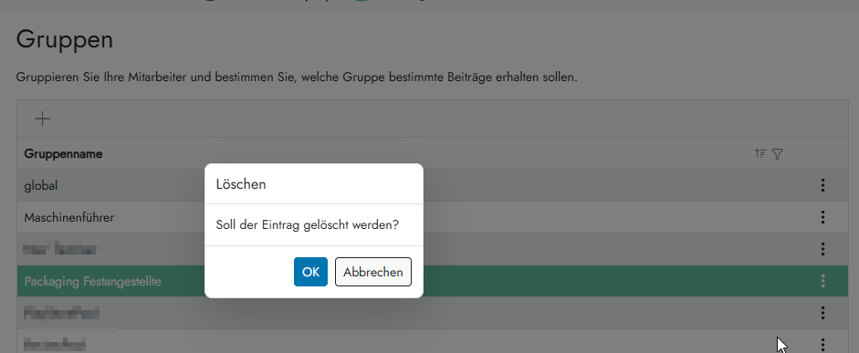 - Hinweis: Bereits veröffentlichte Beiträge der gelöschten Gruppe bleiben bestehen. Mit der gelöschten Gruppe verknüpfte Filter werden automatisch gelöscht.